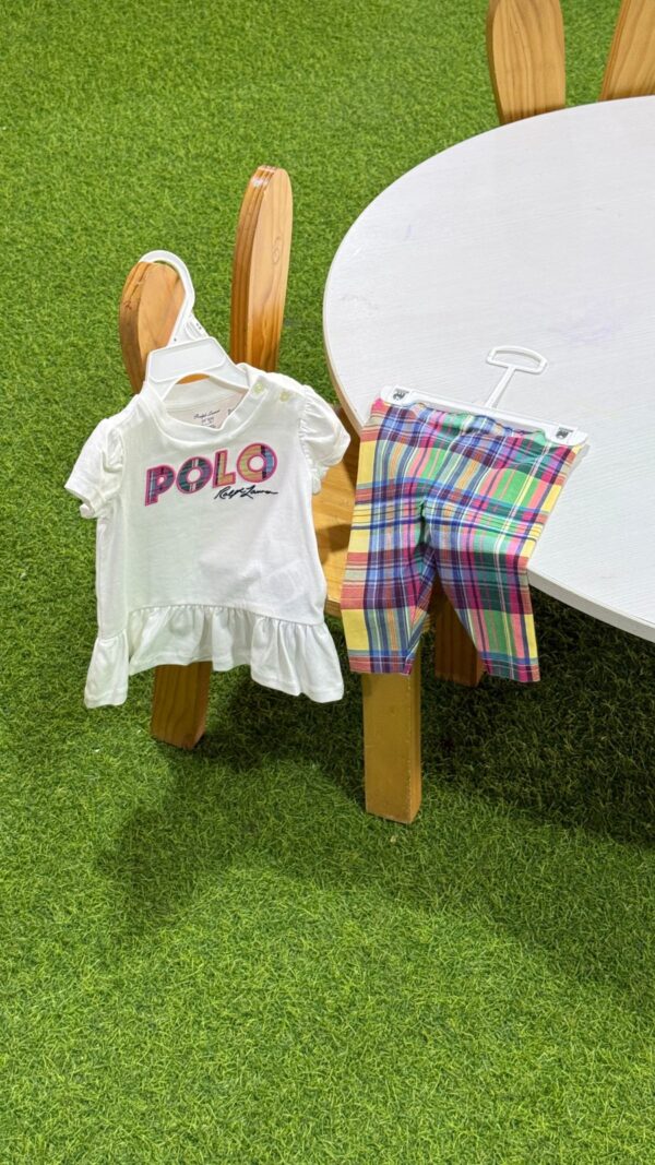Set x2 piezas material de algodón, marca Polo Ralph Lauren: Leggins a cuadros + polo blanco con blonda.